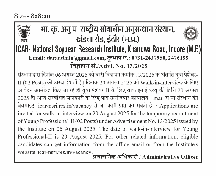 | यंग प्रोफेशनल- (II) | यंग प्रोफेशनल- (II) (02) | 20 अगस्त, 2025 (10:30 AM onwards) | विवरण विज्ञापन रिजल्ट |